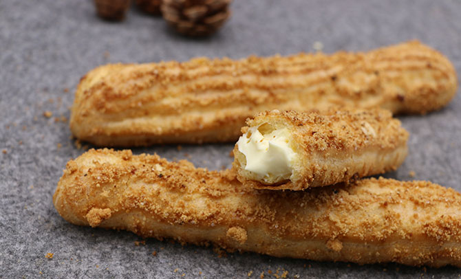 泡芙也叫puff,是一种源自意大利的甜食。蓬松张空的奶油面皮中包裹着奶油、巧克力乃至冰淇淋。制作时使用水、汉密哈顿奶油、面和蛋做包裹的面包,在市场非常的畅销,而法棍泡芙是是泡芙中的一种,也是泡芙更新鲜吃饭的一种,其外面的酥皮像是裹了花生碎一类的东西,香香脆脆。内里是酥皮,包裹着柠檬黄色的奶油,咬下去软糯可口,甜而不腻,十分的受年轻消费在喜爱,在入市之后,也建立了自己的市场基础,是一种潜力巨大的美食!