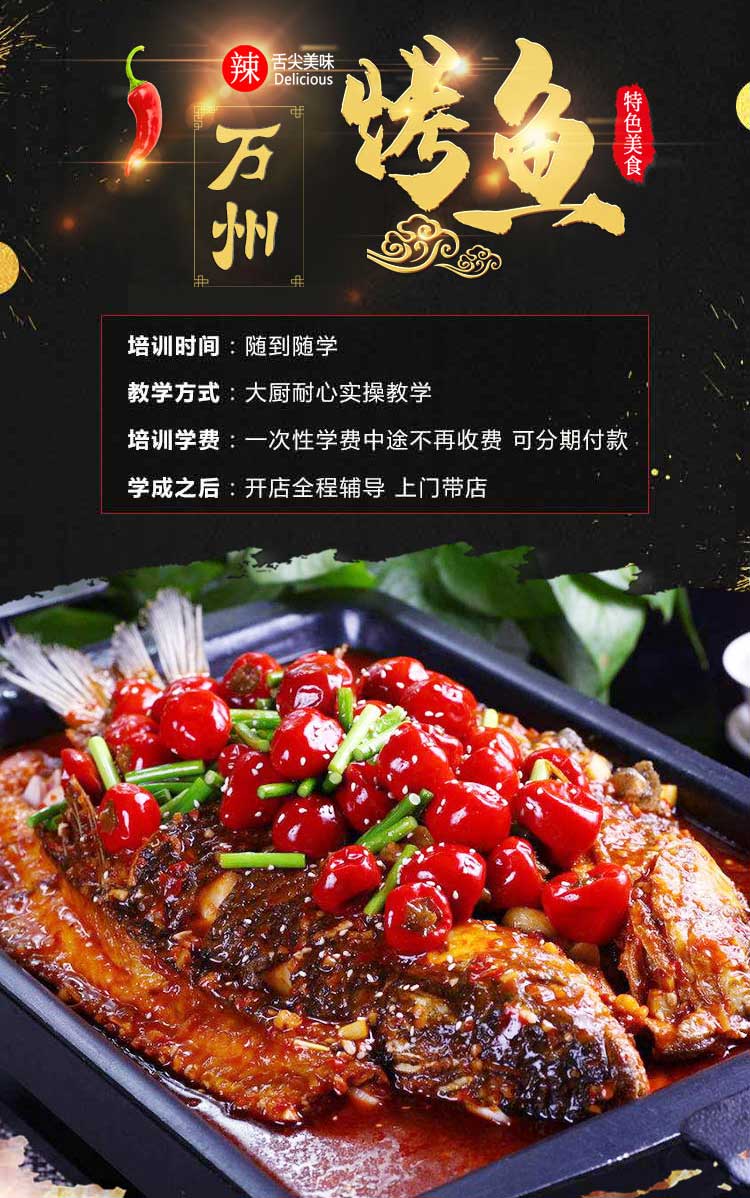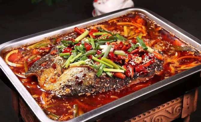 万州烤鱼是属于重庆特色传统名菜,属于渝菜系。万州烤鱼把鱼剖洗净后平放在铁夹中,放在炉上用木炭烧烤,盛到专用铁盘中,浇上用牛油、红油、白糖、花椒、辣椒等调味品炒出底料,放上西芹、豆芽等爽口菜。口味咸辣。
